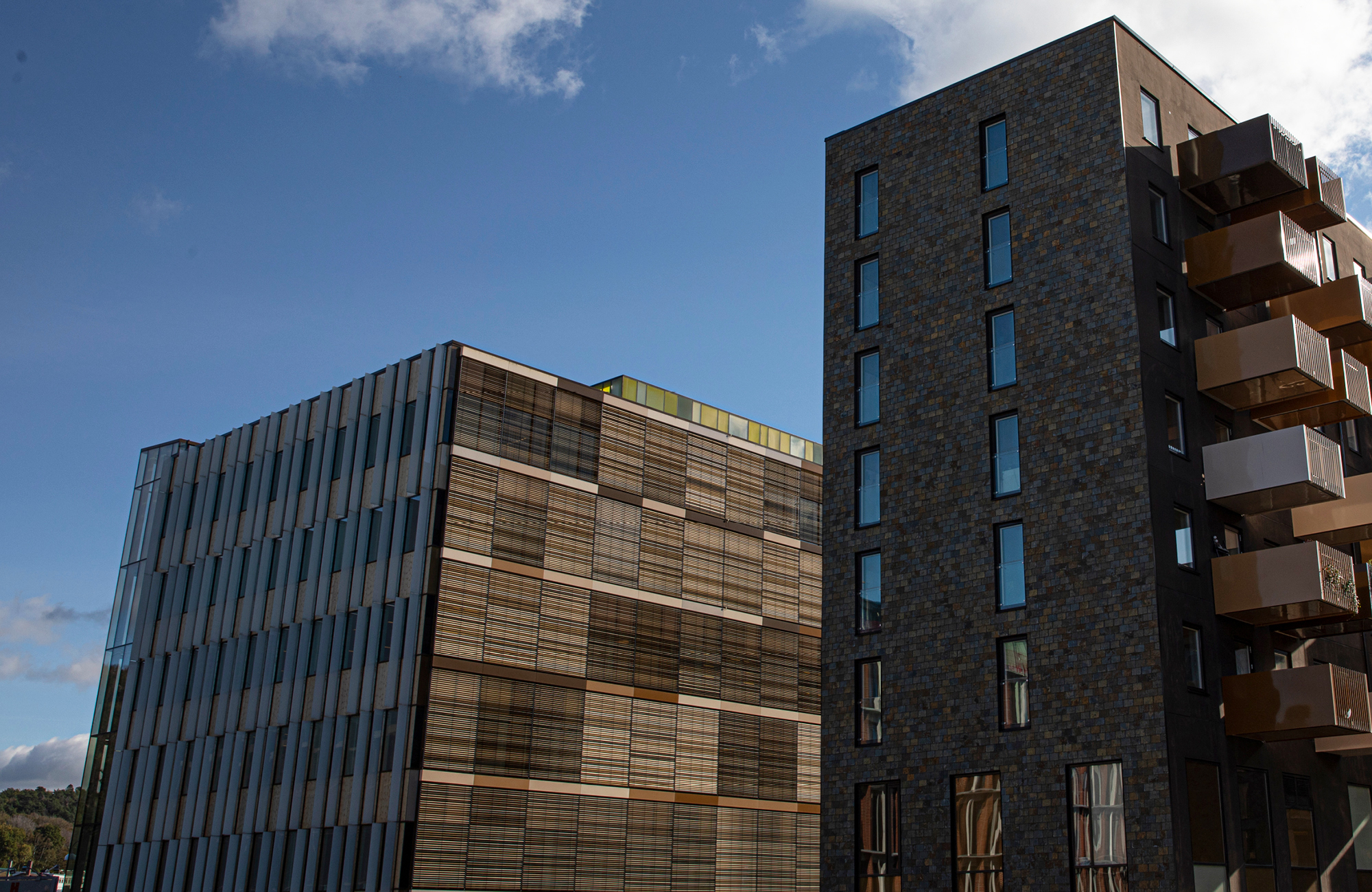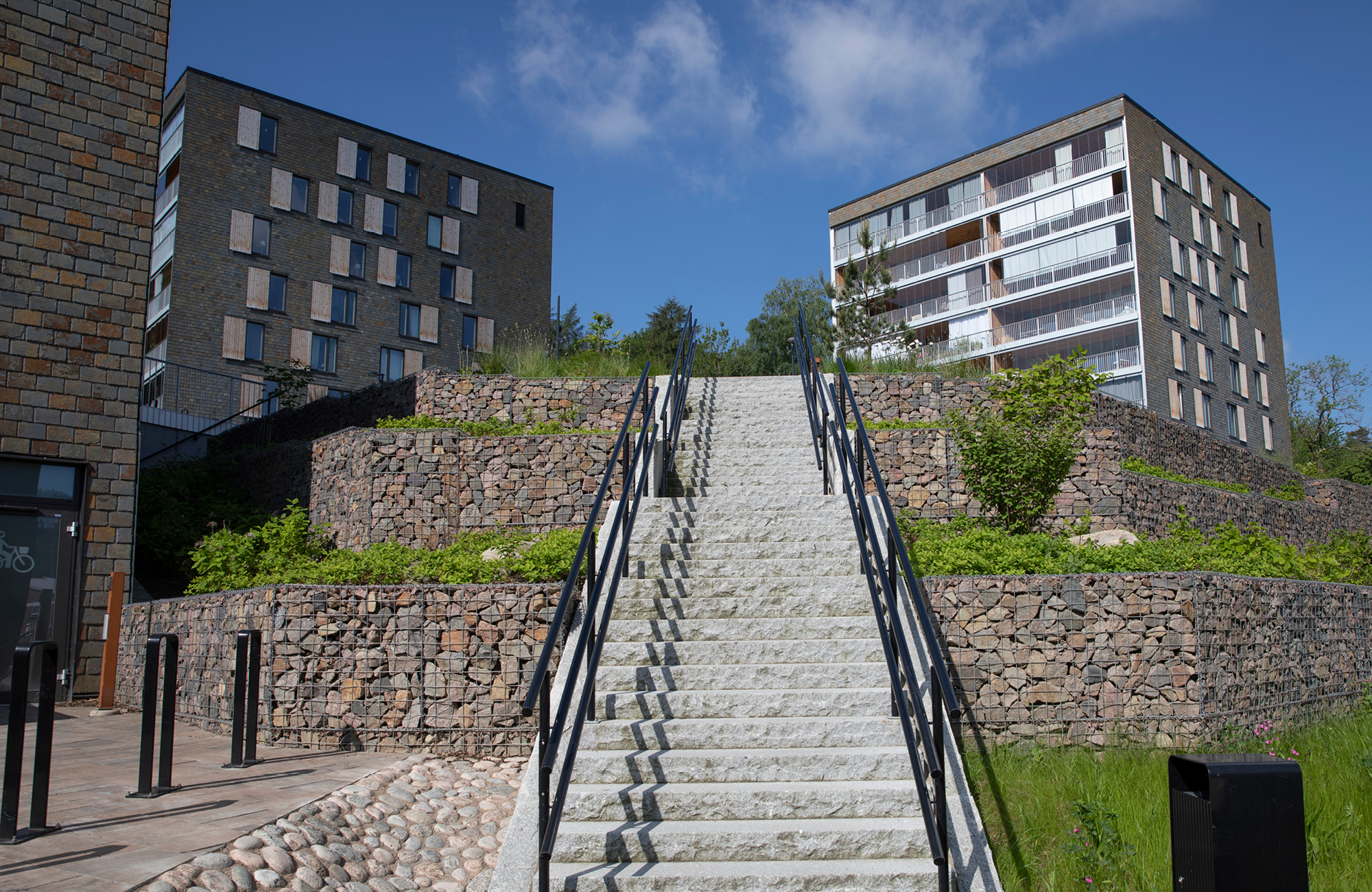 Genom hela området återkommer material som sedumtak, cortenstål och tegel. Material som åldras vackert, snarare än förbrukas.
