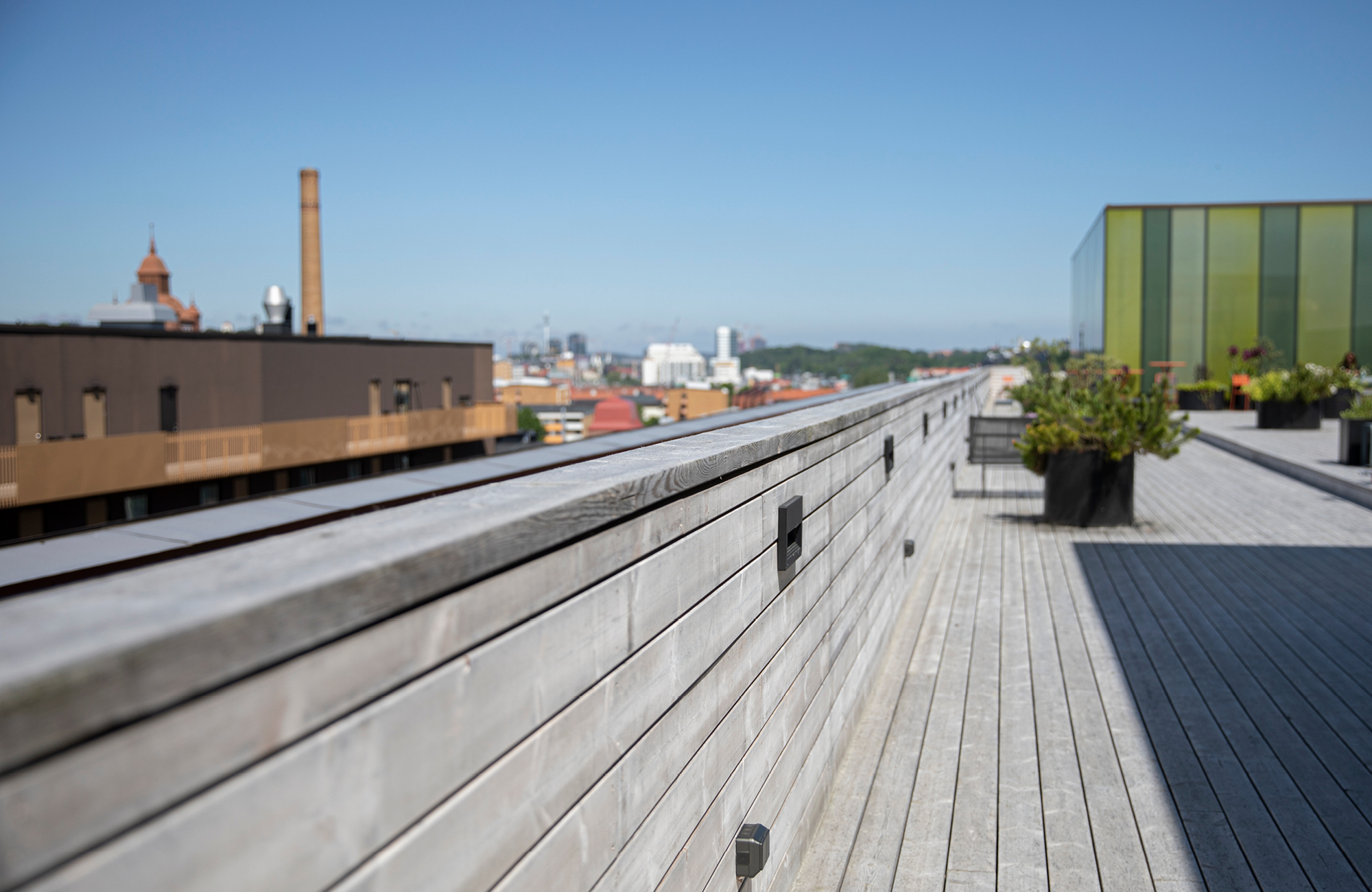 K21 fick fyra olika fasader, anpassade efter solens påverkan. Mot öster, där solbelastningen är som störst, skapades djupa fasader med dubbelglas och en känsla av inglasade balkonger. Mot söder gjordes lösningen grundare, med möjlighet till växtlighet och växthus – en levande självskuggning där man skulle kunna se ut genom grönskan. Mot väster, där huset möter berget, användes persienner i fyra olika färger som tillsammans ger ett intryck av trä – ett mönster som Gert liknar vid trasmattor. Norrfasaden löstes med glaslameller med inlaminerat trä, och högst upp skapades en takterrass med skarpa färger på glaspartier. Det är ett arkitektoniskt resonemang som ger byggnaden ett tydligt eget uttryck.